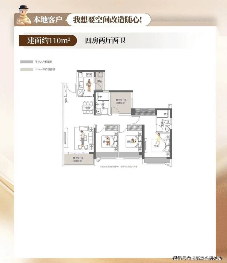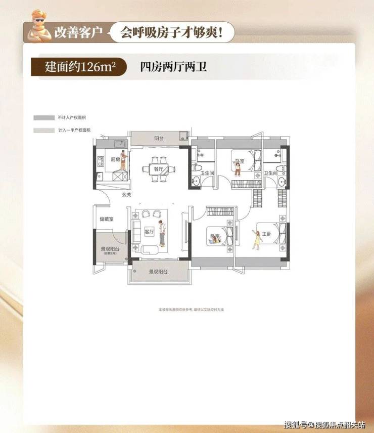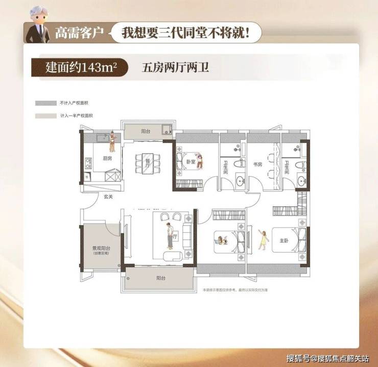 143㎡的正常产品做的是四房户型,粤海却做到了五房,主卧带住房,功能键丰富;南北对流双阳台,四开间朝南