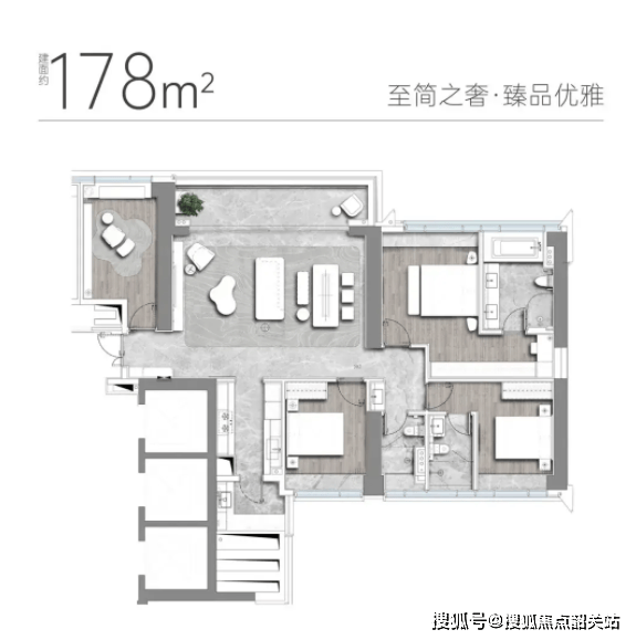 3栋(45层)剩余178㎡四室两厅两卫户型在售,这款户型在设计上更加注重空间的灵活性和实用性。客厅开间达到6米以上,连接着宽达6米的南向大阳台,采光面积极大。厨房采用U型设计,操作动线流畅,方便烹饪。主卧套房设计豪华,配备双台盆洗漱台和独立浴缸,提升了居住的舒适度。