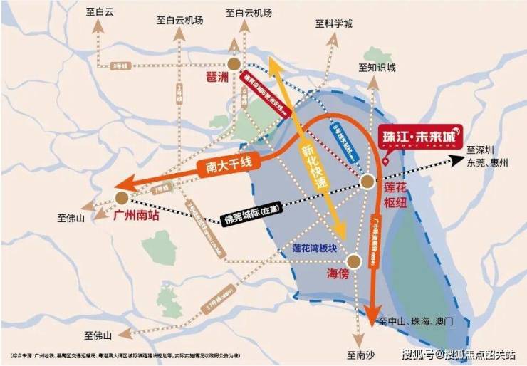 区域还拥有佛莞城轨(在建)、穗莞深城轨琶洲支线(在建)、以及8号线东延段(规划)、广中珠澳高铁(规划)三城轨,17号线(规划)双地铁。未来,不仅可以实现3站到琶洲CBD、万博CBD,4站到南站(佛莞城轨、穗莞深城轨琶洲支线),触角延伸到佛山、东莞和深圳,带领莲花湾向广州主城,乃至湾区各地进发。