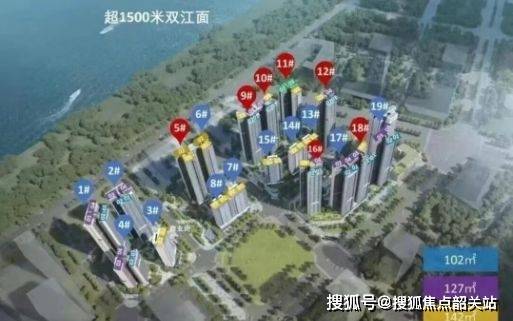 社区建筑立面简约现代,以灰白色与玻璃幕墙组合,塔楼排列遵循半围合式布局,确保视野无遮挡及采光通风。项目南向户型布局均衡,兼顾江景与社区景观,体现低密度、高舒适度住宅理念。