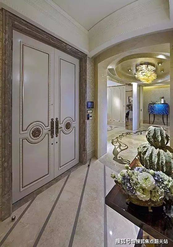 古典风格的米色大门,与室内整体装修相呼应。门面用钛色镜钢镶嵌出郁金香的花型,把手和玄关的地面也运用了郁金香,象征着爱和高贵的名誉。