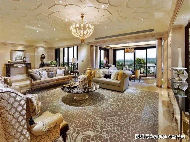 为衔接窗外的江水,地面设计为三种石材拼接的水波纹,来表达海浪的冲刷,因此,客厅的墙面则运用了沙滩色贝壳纹石材,同时也增加了客厅的恢弘气势。