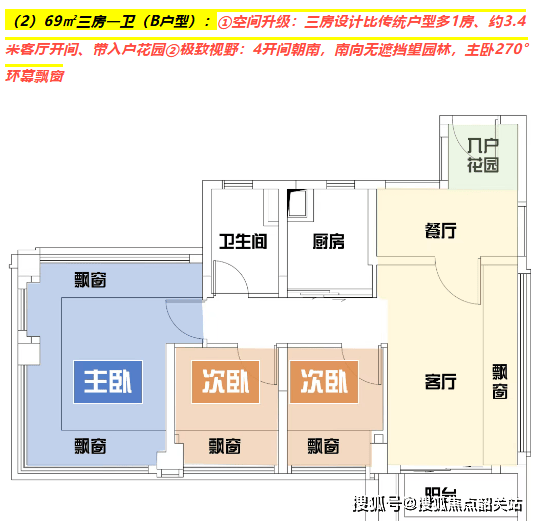 具体来看,六十九平方米的 A 户型,采用了极阔尺度的横厅三房设计。横厅布局不仅增加了室内的通透感,更使得空间显得更加大气磅礴。阳台进深约一点八米,提供了充足的晾晒与休闲空间。主卧面积约十六平方米,宽敞舒适,足以放置大床、衣柜及梳妆台。该户型还拥有四开间朝南的稀缺格局,带入户花园,主卧配备二百七十度环幕飘窗,功能齐全,布局合理。六十九平方米的 B 户型,则在空间升级上更进一步。相比传统户型,它多出了一个房间,实现了真正的三房功能。客厅开间约三点四米,带入户花园,四开间朝南,南向无遮挡望园林,主卧同样拥有二百七十度环幕飘窗,极致视野令人赞叹。