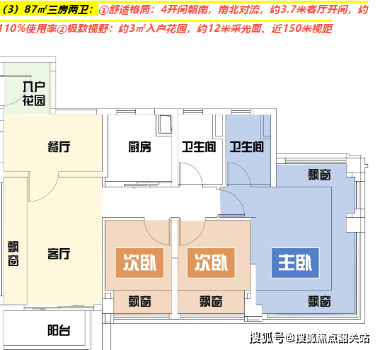 八十七平方米的三房两卫户型,舒适格局令人印象深刻。四开间朝南,南北对流,客厅开间约三点七米,采光面宽阔。约百分之一百一十的使用率,使得室内空间显得格外宽敞。约三平方米的入户花园,不仅增加了收纳空间,更提升了归家的仪式感。近十二米的采光面,让阳光洒满全屋。近一百五十米的视距,保证了视野的开阔与隐私的保护。一百零八平方米的四房两卫户型,则展现了豪宅的尺度。三加一房的大横厅设计,约六点五米宽的超阔阳台,近十六米的采光面,带入户花园,每一项配置都彰显了高端品质。四点五开间朝南,南北对流,主卧二百七十度环幕飘窗,进阶格局完美诠释了改善型住宅的标准。