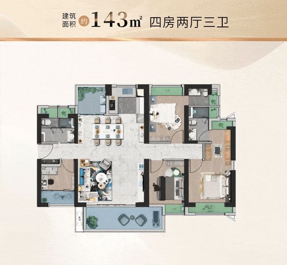 143㎡户型:正南双套房设计,客厅开间达5米,大阳台长约5.8米,四开间朝南,前后双阳台设计,南北对流,超阔楼距,视野无遮挡。