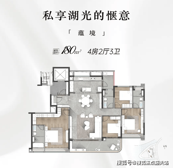 第一种主力户型:180㎡四室三厅两卫,该户型为改善型经典户型,赠送面积约17.51㎡,户型实用率高达93%,总价610万起,目前有44套在售房源。布局上采用LDKG一体化方厅设计,模糊了传统客厅、餐厅、厨房、阳台的界限,创造了家人无间互动的核心场域,空间通透、视野开阔,无论是家庭聚餐还是朋友聚会,都能轻松容纳;四个卧室布局合理,动静分区明确,休息区与活动区互不干扰,保障居住私密性;主卧为套房设计,配备独立卫生间与衣帽间,空间阔绰、采光优良,为业主提供舒适、尊崇的休息空间;次卧空间充足,可根据需求改造为儿童房、老人房或书房,灵活性强;阳台设计宽敞,衔接客厅与次卧,采光通风俱佳,可俯瞰社区景观,兼具休闲与实用功能,日常可晾晒、观景、休闲。该户型整体设计简约大气,注重空间利用率与居住舒适度,适配三口之家或四口之家的改善需求。