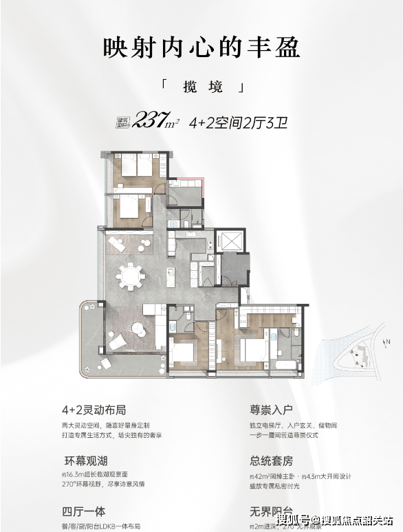 第二种主力户型:237㎡四室两厅三卫,该户型为项目旗舰户型,赠送面积约27.84㎡,户型实用率84%,总价850-950万,目前有44套在售房源,是高端改善家庭的首选。布局上采用大面宽、短进深设计,最大化提升采光与通风效果,整体空间阔绰大气,彰显圈层质感;四室两厅三卫的设计,满足多人口家庭居住需求,动静分区清晰,休息区、活动区、用餐区划分明确,互不干扰;主卧为豪华套房设计,配备独立卫生间、衣帽间与观景飘窗,空间宽敞舒适,采光通风优良,可俯瞰莲花湾中心湖一线景观,享受静谧与尊崇;两个次卧同样为套房设计,配备独立卫生间,满足家人隐私需求,另外一个次卧可作为书房、儿童房或休闲室,灵活适配家庭不同阶段的需求;客厅配备约270度IMAX巨幕阳台,将湖光城景引入室内,观景效果极佳,阳台空间宽敞,可打造为休闲区、观景区,提升居住体验;厨房采用U型设计,操作空间充足,动线合理,方便家人烹饪,同时衔接餐厅,用餐便捷;整体户型设计注重细节与质感,兼顾实用性与舒适性,每一处空间都经过精心规划,满足高端家庭对居住品质的极致追求。