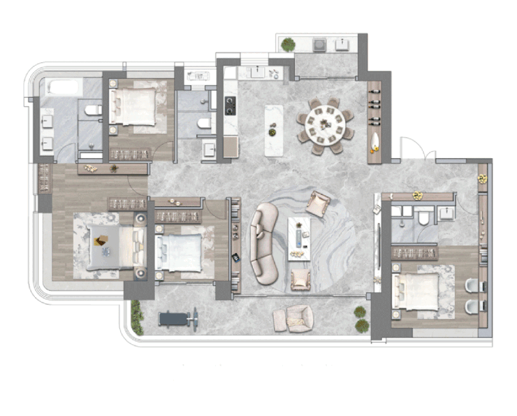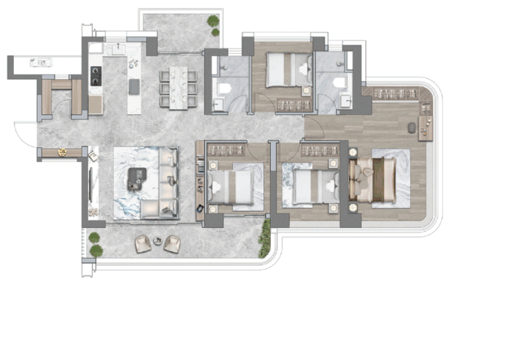 173㎡户型:打破传统面积局限,通过开放式公区设计和功能复合化布局,实现了“小面积、大格局”的越级享受。
