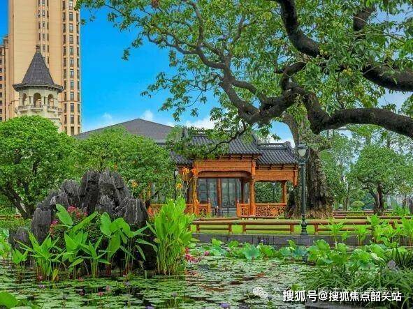 生态资源是本案的重要支撑。项目三面环山,与香雪公园毗邻,外部自然景观条件优越。内部园林体系以江南水系为蓝本构建,一岛一栋的布局逻辑配合三重水系规划,使建筑与水体、绿植形成层次分明的空间关系。名贵树种全冠移植,落地即呈现成熟绿化效果,避免新盘常见的“幼龄园林”阶段。景观营造不仅是视觉呈现,更是居住舒适度的重要组成。