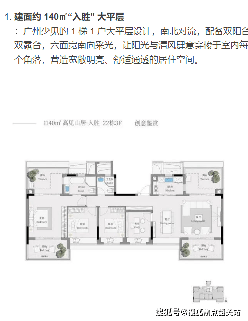 建面约140㎡“入胜”大平层:南北对流设计,配备双阳台双露台,六面宽南向采光,营造宽敞明亮的居住空间。
