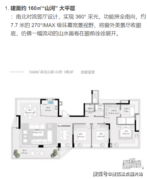 建面约160㎡“山河”大平层:实现360°采光,约7.7米的270°IMAX级环幕宽景视野,将窗外美景尽收眼底。