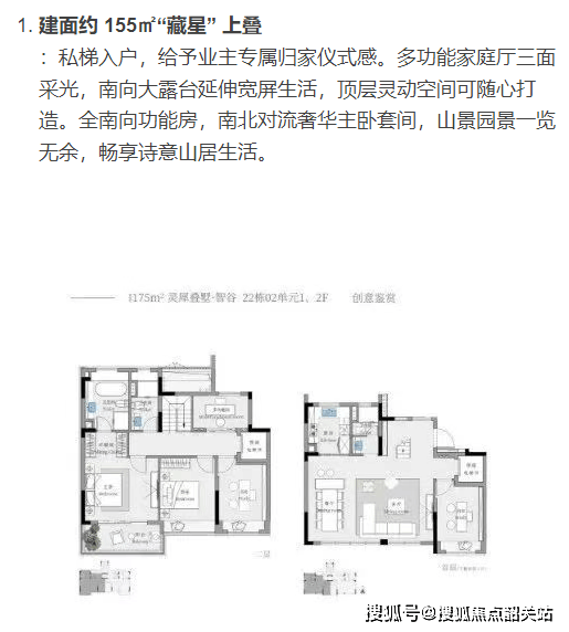 建面约155㎡“藏星”上叠:私梯入户,多功能家庭厅三面采光,顶层灵动空间可随心打造,享受诗意山居生活。