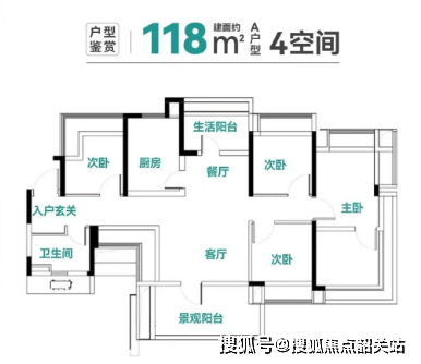 建面约118㎡B户型 270°环幕飘窗,次卧直望中央公园