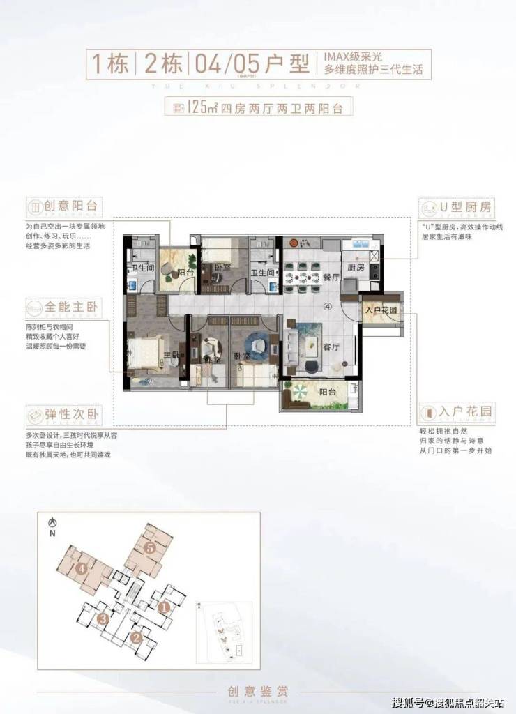 项目仅提供两种住宅户型:99㎡三房两卫与125㎡四房两卫。所有住宅单元均朝南,无北向户型,这在高密度开发区域较为少见。99㎡户型采用经典竖厅布局,客厅与卧室分处动静两侧,主卧带飘窗,另设两个阳台——一个面向景观面,一个用于家政功能,实现干湿分离与功能分区。125㎡户型则增加入户花园作为缓冲区,并在主卧配置独立衣帽间与大尺度飘窗,次卧之间可通过灵活隔断形成共享活动空间,适合多孩家庭。值得注意的是,由于4栋住宅呈点状围合布局,多数楼层视野开阔,低区也能获得较好采光。