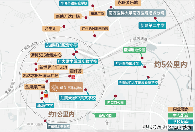 项目300米范围内即有童伴荟社区商业体,1公里半径内聚集金海岸城市广场、永旺梦乐城、新塘万达等成熟商圈。据公开数据,新塘片区已开业及规划中的商业体量超300万平方米,相当于约18.75个天河城的规模。日常购物、餐饮、娱乐选择极为丰富。医疗方面,南方医院增城分院(三甲)距离约4公里,驾车10分钟可达;社区卫生服务中心也在1.5公里范围内。教育资源虽非项目自持,但如前所述,对口学校具备一定竞争力。