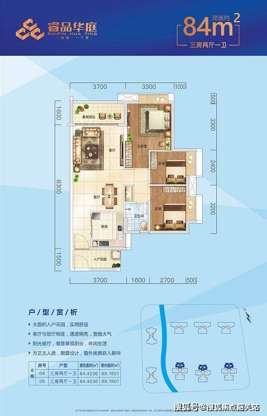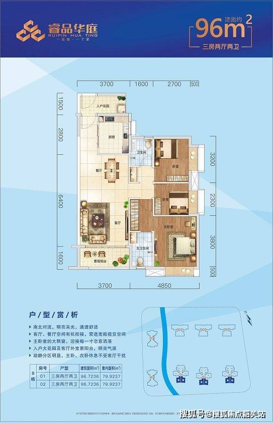 户型设计注重品质与实用性。建面约 84㎡ - 97㎡的户型,南北对流,通风采光良好。户户均带入户花园,增加了居住的舒适度和私密性。虽未明确提及得房率,但从户型设计来看,空间利用较为合理,能够满足不同家庭结构的居住需求,为业主打造舒适的居住空间。
