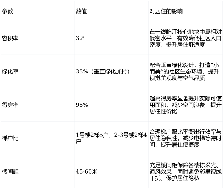 主力在售户型为约96㎡三房两厅两卫、120㎡四房两厅两卫、140㎡四房两厅三卫,覆盖改善与高端自住需求。户型设计以南向为主,多数户型可享受一线江景体验,其中140㎡户型客厅带超大观景阳台,江景视野极佳。95%的超高得房率在同区域项目中极具竞争力,有效提升实际居住空间。