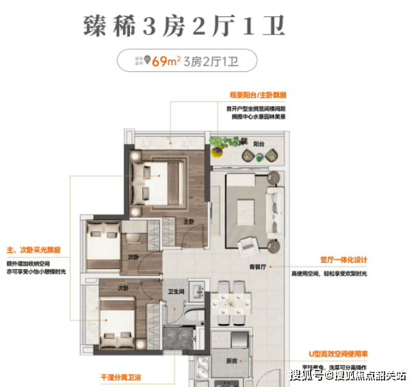 1. 建面约69㎡三房两卫:年轻刚需的“上车优选”