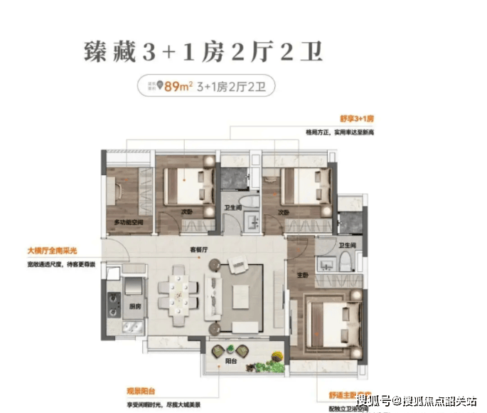 建面约89㎡四房两卫户型,延续了项目高实用率的特点,同时在空间通透度上做了进一步提升,能够满足多成员居住的私密性需求,适配人口稍多的刚需家庭。