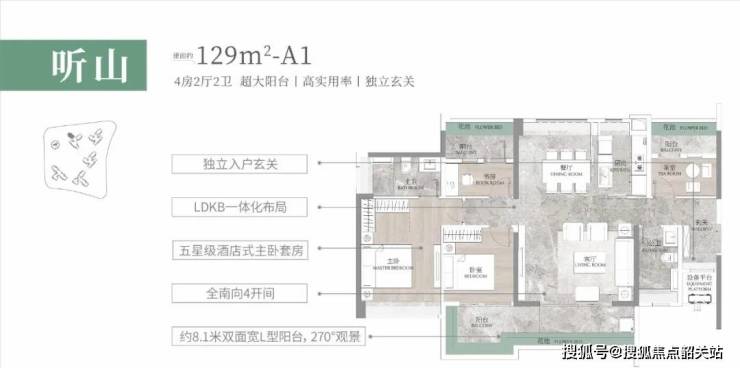 建面约129㎡听山户型,阳光玄关设计,兼容了户内的私密性,储物空间又是全明采光,也符合广东地区对风水的理解,舒适性和实用性都考虑到。