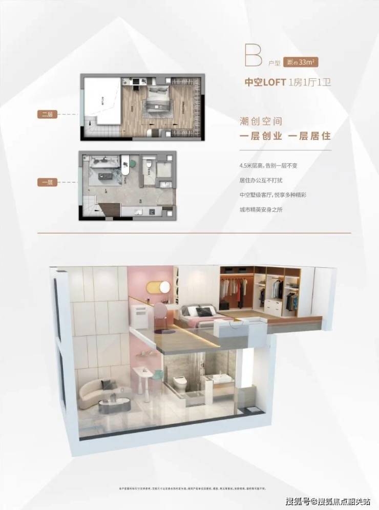公寓部分规划了3栋21层高楼栋,4梯16户loft设计,共推出288套房源,户型层高4.5米,为精装交付。