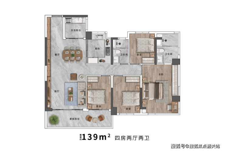 约139㎡四房两厅两卫:专梯专户设计,给予身份地位相匹配的尊崇舒居体验,完美协调社交与私密需求的舒适尺度。