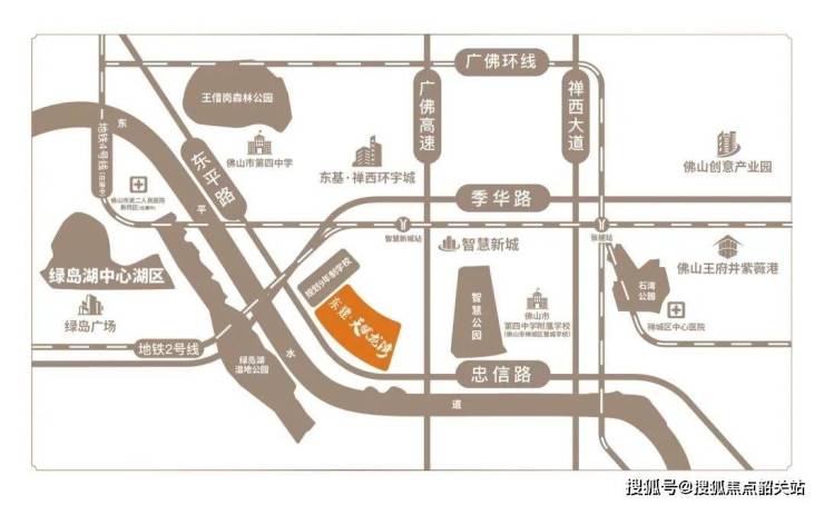 东建·天赋龙湾位于禅城黄金商务带,季华路与东平河中轴交汇之处,是张槎智慧新城CBD的“中部创新走廊”。项目距离地铁2号线智慧新城站仅约500米,并且紧邻在建中的地铁4号线和广佛环线,能够快速通达广佛两地。周边形成了两横三纵的立体交通网络,包括季华路、魁奇路、广佛高速、佛山大道和禅西大道,方便居民出行。