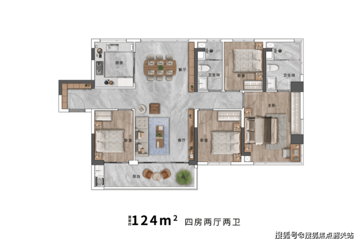 约124㎡四房两厅两卫:进一步提升了居住空间的舒适度,适合大家庭居住。