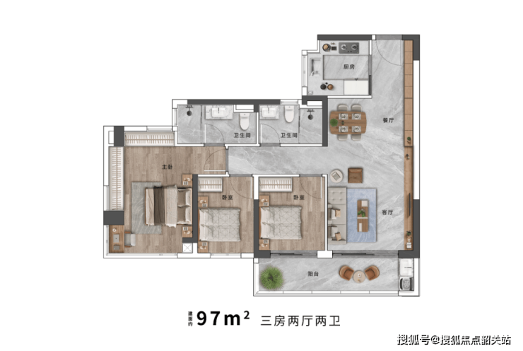 约97㎡三房两厅两卫:紧凑实用,适合年轻夫妇或小家庭。