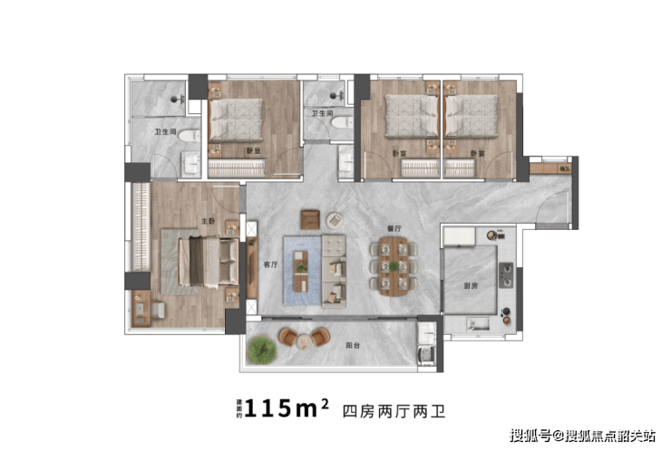约115㎡四房两厅两卫:空间宽敞明亮,适合追求舒适生活的家庭。