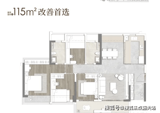 115㎡四房:南北通透,双阳台设计,实测套内面积 122㎡,赠送率达 15%,主卧套房带步入式衣帽间(10.5㎡),厨房预留双开门冰箱位,适合改善型家庭,对比同区域 110㎡户型,多出一个独立储物间。