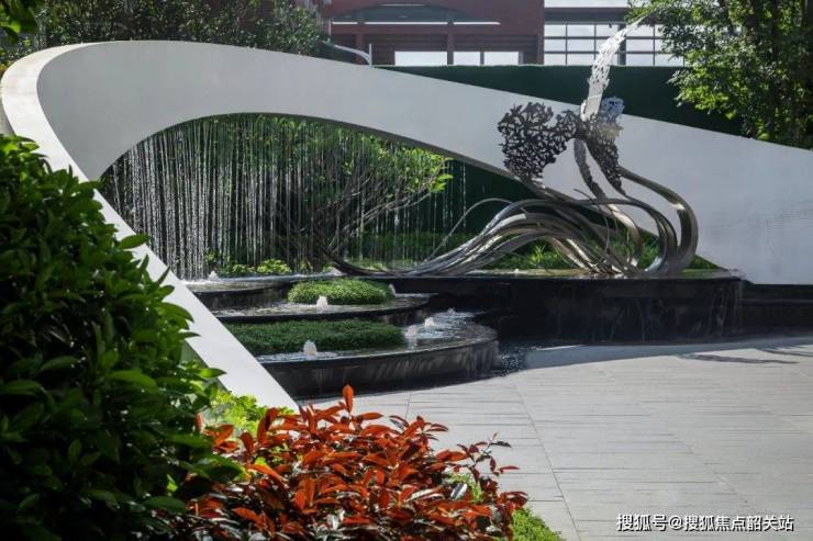 迎宾广场两侧借地势设置特色跌级水景,潺潺流水之声如珠玉落盘,拾级而上,聆听水声,感受惬意的生活体验。