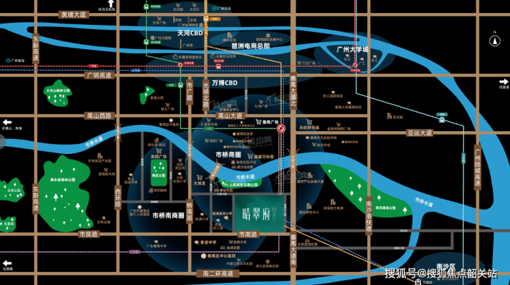 项目距离地铁3/18/22号线交汇的番禺广场站约1.5公里,周边设有蚬涌市场站、蚬涌路口站等公交站点,番21B路、番5路等线路可直达地铁站,30分钟内可达珠江新城。自驾出行毗邻番禺大道、华南快速等主干道,早晚高峰时段,从项目出发至天河CBD仅需40分钟。未来,地铁17号线桥南站的规划落地,将进一步提升项目的交通优势。