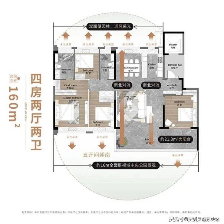 2. 7栋:160㎡四房两厅两卫,同样是2梯2户设计,空间尺度充裕,该户型的客厅和餐厅空间十分宽敞,适合大家庭居住,而且推窗就能看到公园景观,生态环境优越,精装交付标准高,配备新风系统、中央空调和智能安防,拎包即可入住。