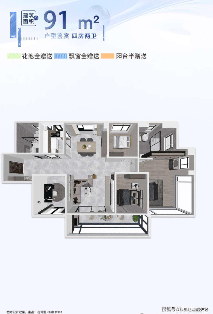 88㎡和 91㎡的四房两卫户型同样亮点十足,充分利用空间,满足家庭不同阶段的居住需求 。