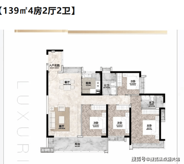 设计亮点: 采用“四叶草”布局,四个房间分布于房屋四角,互不干扰,隐私性极强。LDKB一体化设计(客厅、餐厅、厨房、阳台一体化),打造出约40㎡的家庭核心交互区,大气开阔。主卧配备步入式衣帽间和明卫,彰显主人尊崇感。