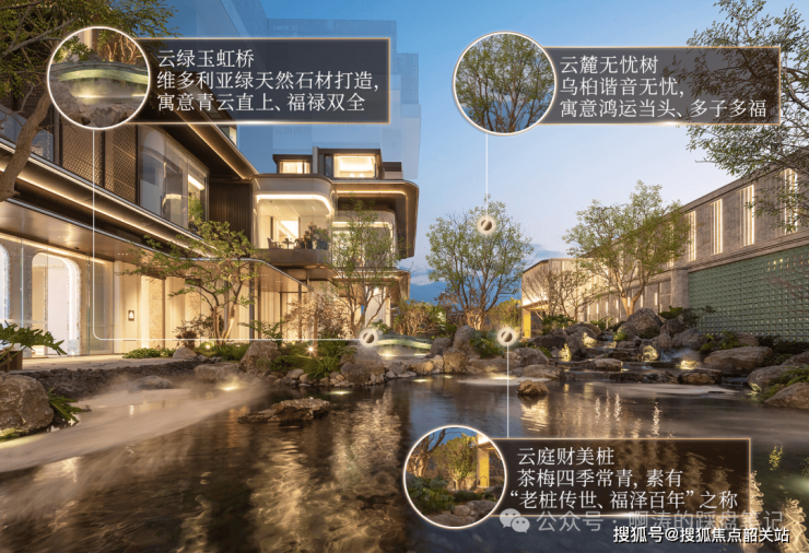 国贸・绿城 | 云樾和鸣以 “引山入园” 为核心理念,打造了 “四幕九境” 的东方意境园林,将白云山的 “云、林、泉、石” 四种自然元素解构重组,融入社区园林景观打造,在城市核心区复刻了云山诗意的居住体验。项目社区主入口采用皇家翠玉门头与漫云灰石材打造,还原了白云山层峦叠嶂、云雾缥缈的气韵,入口处设置云起百代松与汝窑天青色陶砖景墙,打造了极具仪式感的归家第一境。社区内以蜿蜒的游山廊作为动线骨架,串联起林、泉、溪、石等多重景观节点,环形洄游的森林小径营造了 “曲径通幽” 的景观意趣,溪谷景观依自然高差打造,野山石错落堆叠,复刻了白云山溪谷的自然灵韵。社区中央打造了镜面水池,依托隐蔽式循环系统实现终年清澈,倒映建筑与天空,实现了 “虽由人作,宛自天开” 的景观效果。