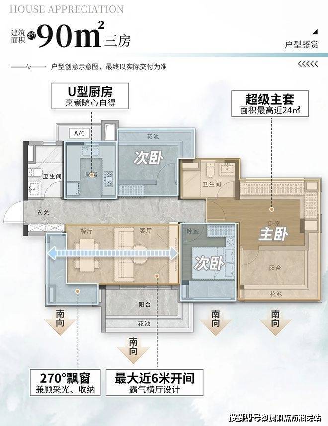 90-94㎡三房:总价510-520万,无承重墙设计,可改四房,使用率超100%!