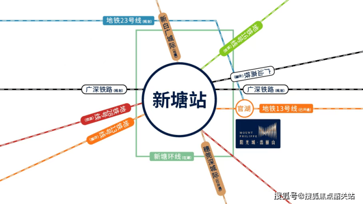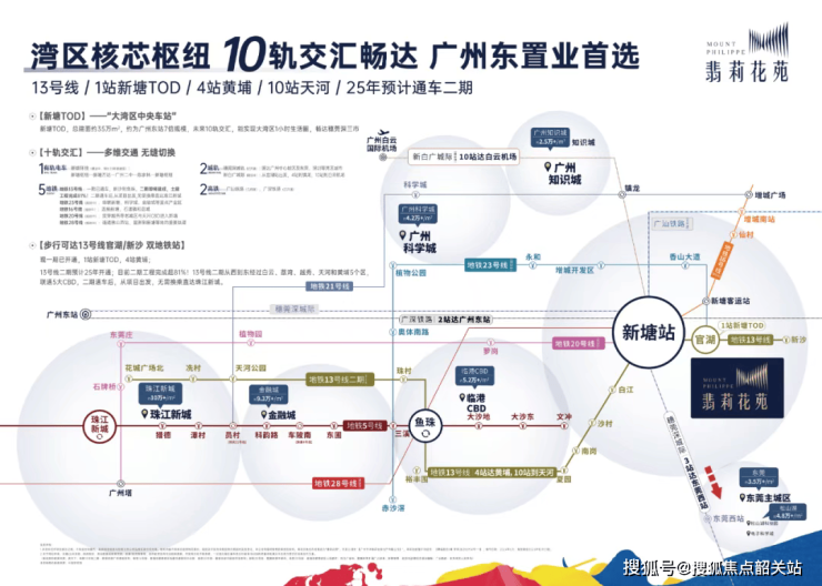项目地处地铁13号线官湖站旁,步行即达,真正实现“地铁上盖”级出行效率。1站即可抵达新塘TOD枢纽——该枢纽已规划形成“4地铁+2城际+2国铁+1轻轨”的九轨交汇格局,未来将高效串联佛山、广州、东莞、深圳四大湾区核心城市,推动“穗莞同城化”进程。此外,经由13号线4站可达黄埔科学城,快速接驳天河CBD,大幅缩短跨区通勤时间,赋能湾区职住平衡新范式。