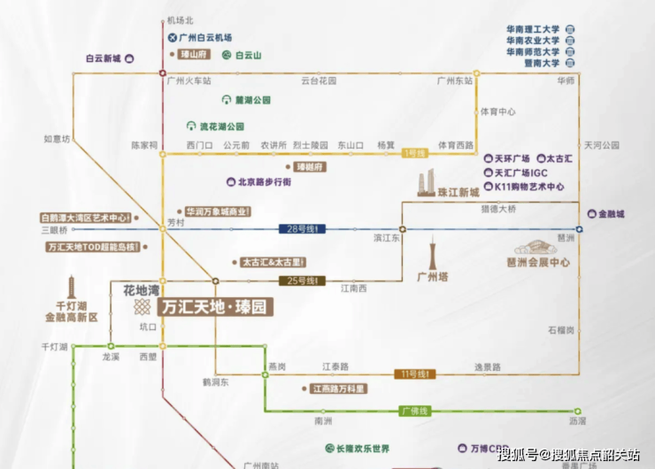 花地湾TOD枢纽:地铁1号线、25号线(规划中)交汇换乘点,距离地铁花地湾站约800米,步行大概12分钟。