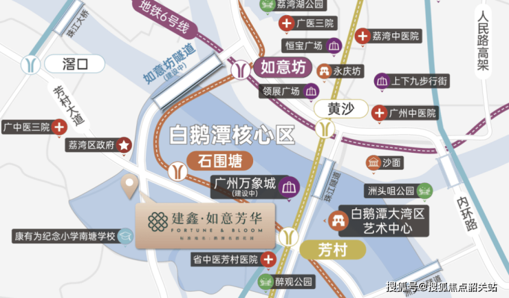 建鑫·如意芳华坐落于荔湾区芳村大道中,如意坊隧道旁,地理位置兼具文化底蕴与城市发展潜力。项目左侧毗邻荔枝湾、沙面岛及永庆坊等广府文化核心区域,能够感受两千年的历史沉淀与传统建筑魅力。右侧紧邻白鹅潭CBD,核心商业体量高达千亿级,汇聚金融、商业及文旅资源,形成成熟都市生活圈。