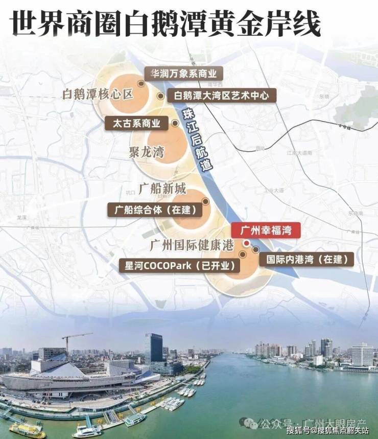 场景化描述:您购买的不仅是一套房子,更是白鹅潭这个未来城市级CBD的“原始股”。根据《白鹅潭地区发展规划(2023-2035年)》最新批后公示,白鹅潭被定位为“广州西部核心功能区”、“国际消费中心城市重要承载地”。广州幸福湾正位于此规划的核心地带。项目背靠的广州国际医药港,其一期90万方健康方舟已全面运营,约12万方的星河COCO Park已开业,星巴克、奈雪的茶、金逸影院等已入驻。而更令人期待的是,2026年初,广州市政府与华润集团已签订战略合作协议,明确广州首座万象城落户白鹅潭,距项目仅约1.5公里。同期,滨江太古商业也在紧密推进中。这意味着,未来五年内,家门口将形成“COCO Park+万象城+太古里”的顶奢商业金三角。