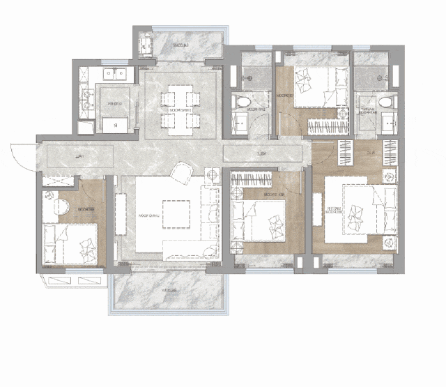 120㎡平层四房两卫采用经典横厅布局,格局方正,四开间朝南,南北对流搭配双阳台设计,保障空气流通与全天候采光。两种户型均注重空间效率与家庭代际共居逻辑,适合二孩家庭或三代同住场景。