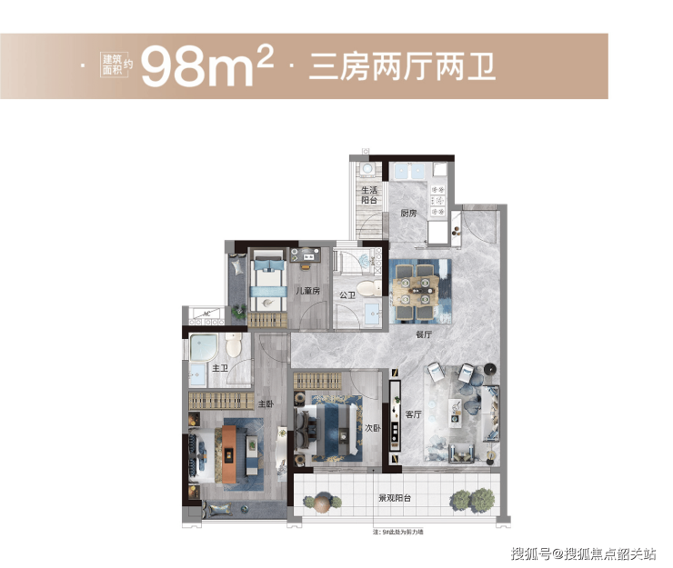 98㎡三房户型,定位刚需友好型,户型方正紧凑,空间布局合理,动静分区清晰,客厅连接景观阳台,保证室内采光与观景效果。三房设计满足三口之家的居住需求,主卧配备飘窗,提升休憩舒适度,儿童房与书房布局合理,可根据家庭需求灵活改造,兼顾实用性与灵活性,让刚需家庭也能享受高品质的江居生活。