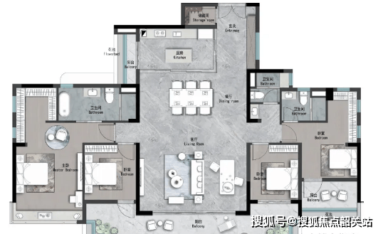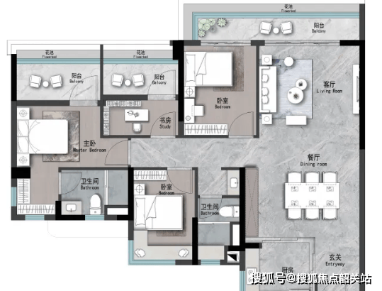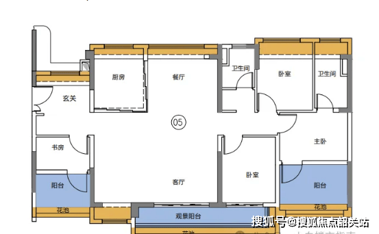 建面约142㎡四房两厅三卫:奢阔四房户型,空间宽敞,布局大气,三室卫生间设计,可满足多人口家庭的使用需求,避免早晚高峰期卫生间拥挤的问题,主卧带独立卫生间、衣帽间与飘窗,采光通风俱佳,客厅连接超大景观阳台,可欣赏社区园林美景,适合高端改善型家庭。