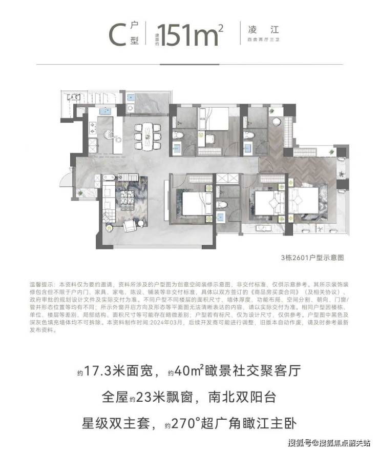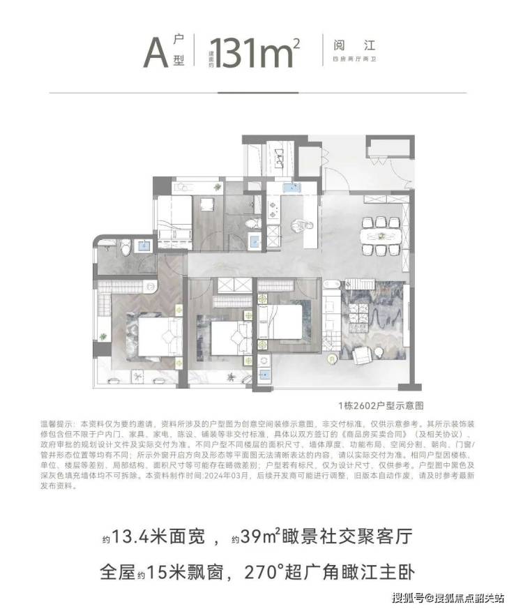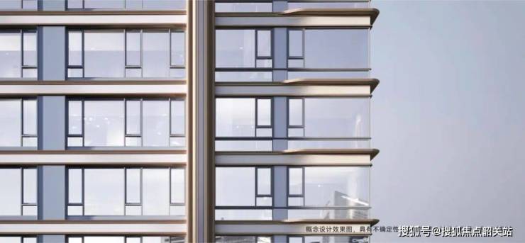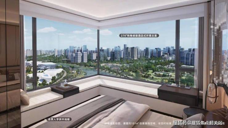 建筑立面采用钻感鎏金天幕,辉映顶部金色徽标,迭代区域居所的美学穹顶;约130m天幕地标,将楼体朝江旋转15°,户户东南向270°观景,实现江景平权的瞰江体验。