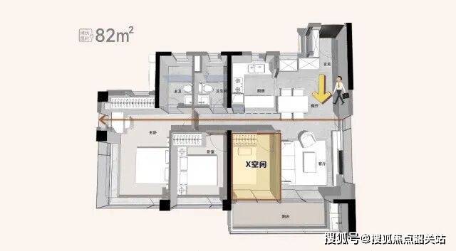 82平方米户型:所有卧室均朝南,客厅、卧室位于南边,双卫、厨房位于北边,整体通风采光良好。