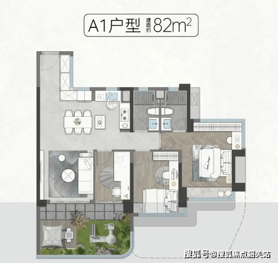 建面约 82㎡三房两厅两卫:使用率约 120%,打掉 X 空间后可形成约 25㎡大通厅,搭配约 6㎡露台(下沉式草坪设计),总价 220 万起即可实现刚需上车;