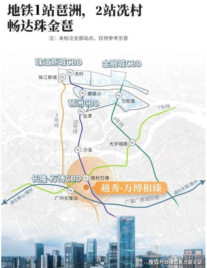 交通便利性十分突出。首发 CBD 组团 F1 - 2 地块在锦绣香江别墅群中间,与万博商务区直线距离约 600 米,步行至南村万博 E1 口约 1.3 公里,可骑行接驳。南村万博是 7 号线与 18 号线交汇站,广州南站、老黄埔、科学城、琶洲、珠江新城等都能一站直达,无论是日常通勤还是前往城市各处都极为便捷,轻松畅达城市核心区域。