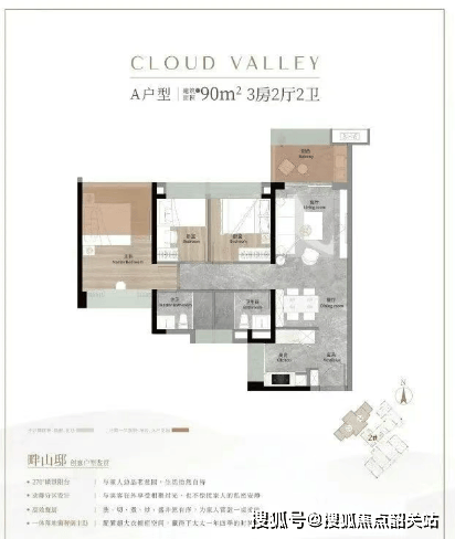 90㎡A户型3房2卫:紧凑实用,适合年轻家庭。